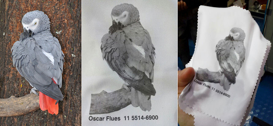 Tomamos como a imagem do pássaro da esquerda e realizamos as amostras impressas em tampografia no tecido, demonstradas nas imagens do centro e da direita.